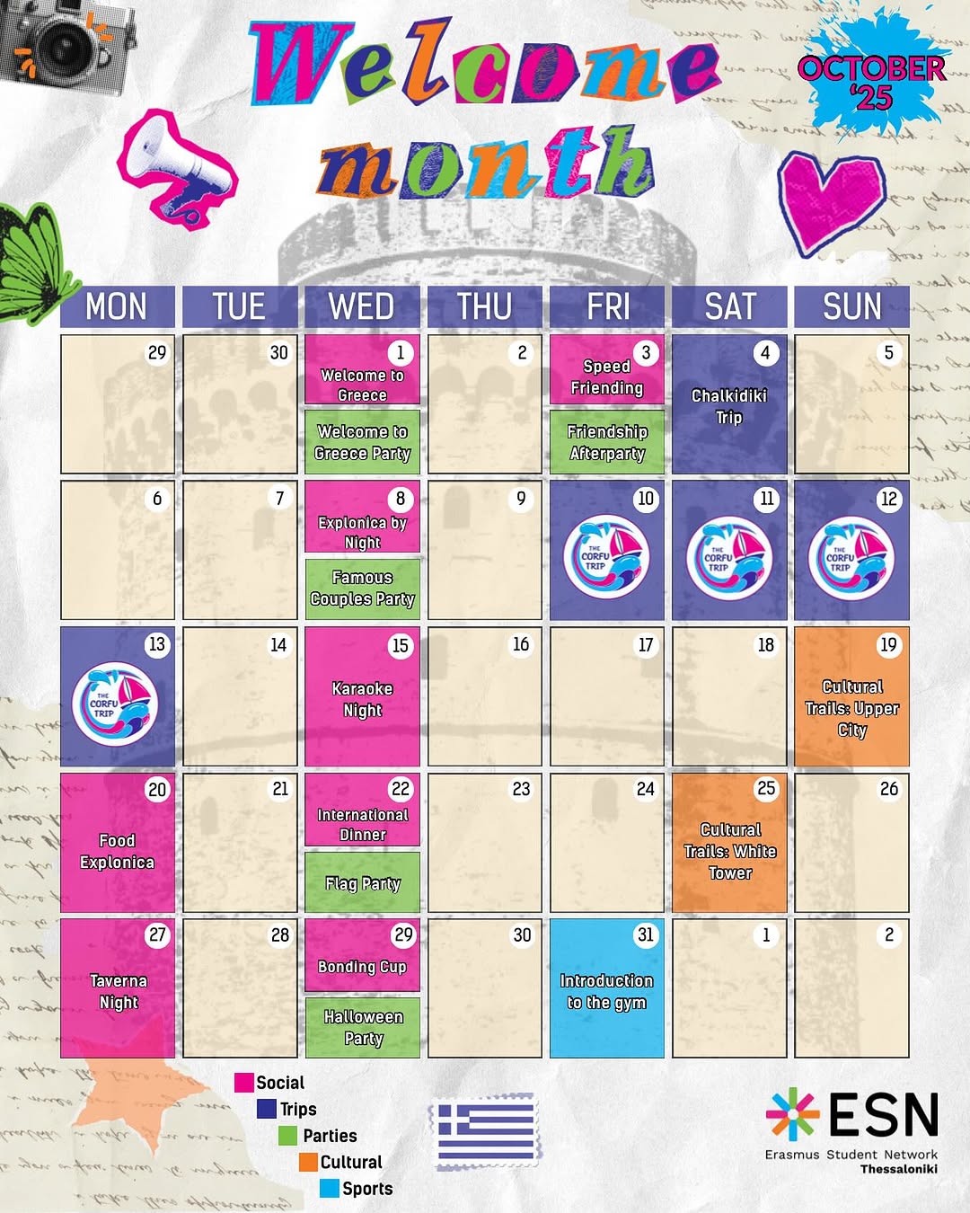We have made sure to fill the month of October with all sorts of activities to get to know each other, the city, and ESN itself. Wether a newcomer, an erasmus veteran staying for one more semester or a local keen on having fun and meeting new people, come check out what we have planned for you!